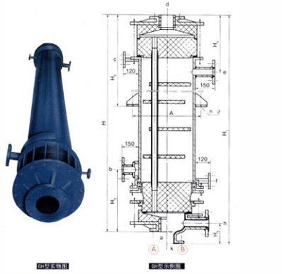 西达牌GH型浮头列管式石墨热交换器分为GHA(换热管内,外径为直径022/032)与GHB(换热管内,外径为直径036/050)两大系列,其结构类同。换热管表面光滑、流体流动阻力小,不易附着结晶物及结垢物。除表列规格外,本公司还生 产GHA1400-395至GHA1800-810及GHB1200-200至GHB2000-660各种规格产品,并可按工艺需要设计、生产双向耐腐蚀及壳程或管程多程等特殊结构产品。带气液分离器的产品型号末尾加标注(F)用户订货时注意:照片示实物图,图示为热交换器结构图。